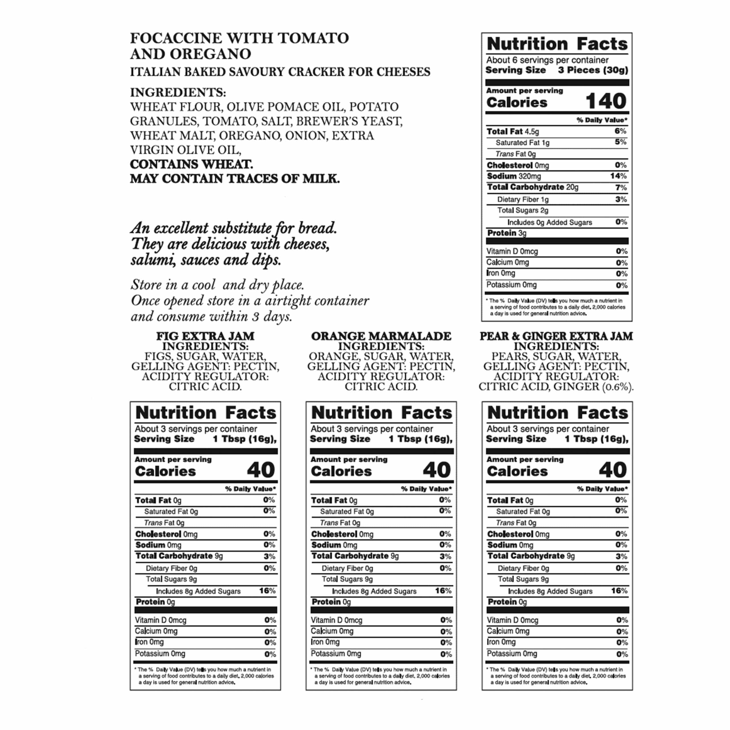 An elegant Tuscan-style cheese tasting set featuring tomato & oregano focaccine crackers and three gourmet jams (fig, orange, pear & ginger) crafted for enjoying alongside artisan cheeses and curated wines during the holiday season and beyond.