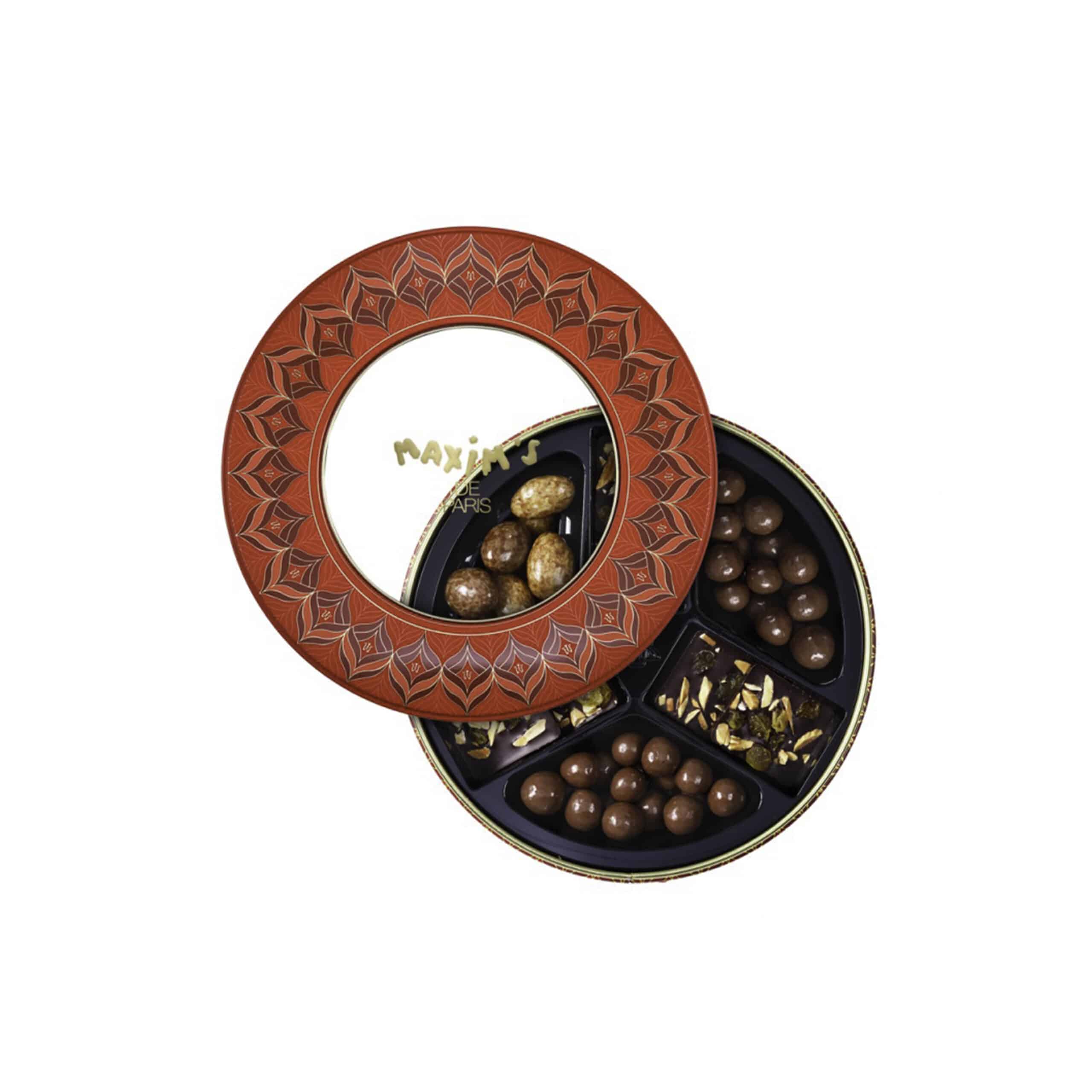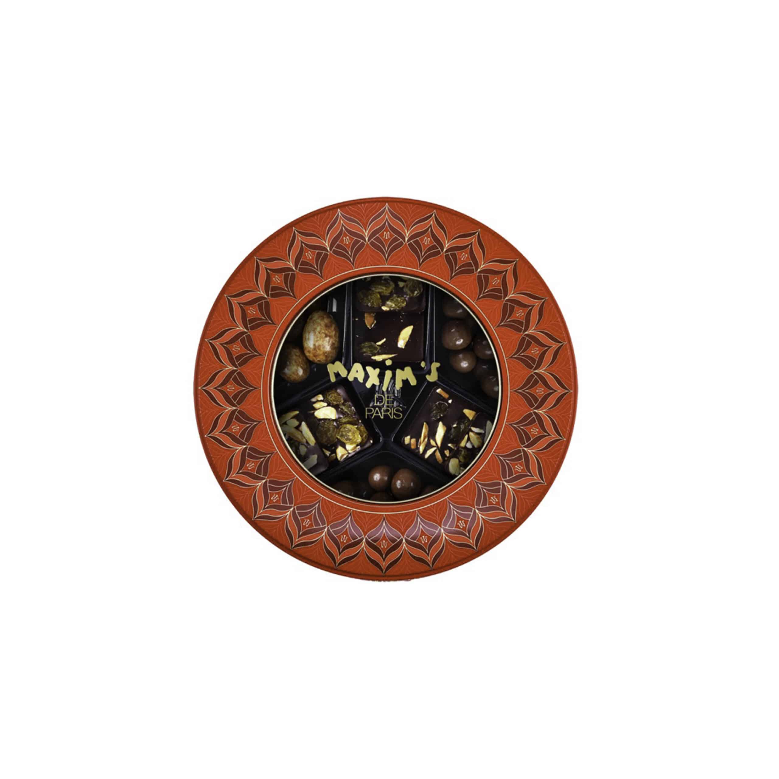 This assortment is full of surprises for chocolate lovers who want to discover new gourmet horizons. Inside this nice round box, delicious almonds and hazelnuts coated with chocolate are waiting for you, next to the famous Maxim’s chocolate pearls whose finesse and success are no longer to be proven. Not forgetting the real gourmet temptation and a classic for chocolate lovers: chocolate squares with almonds and raisins, a combination of subtle flavors that will delight the finest palates.