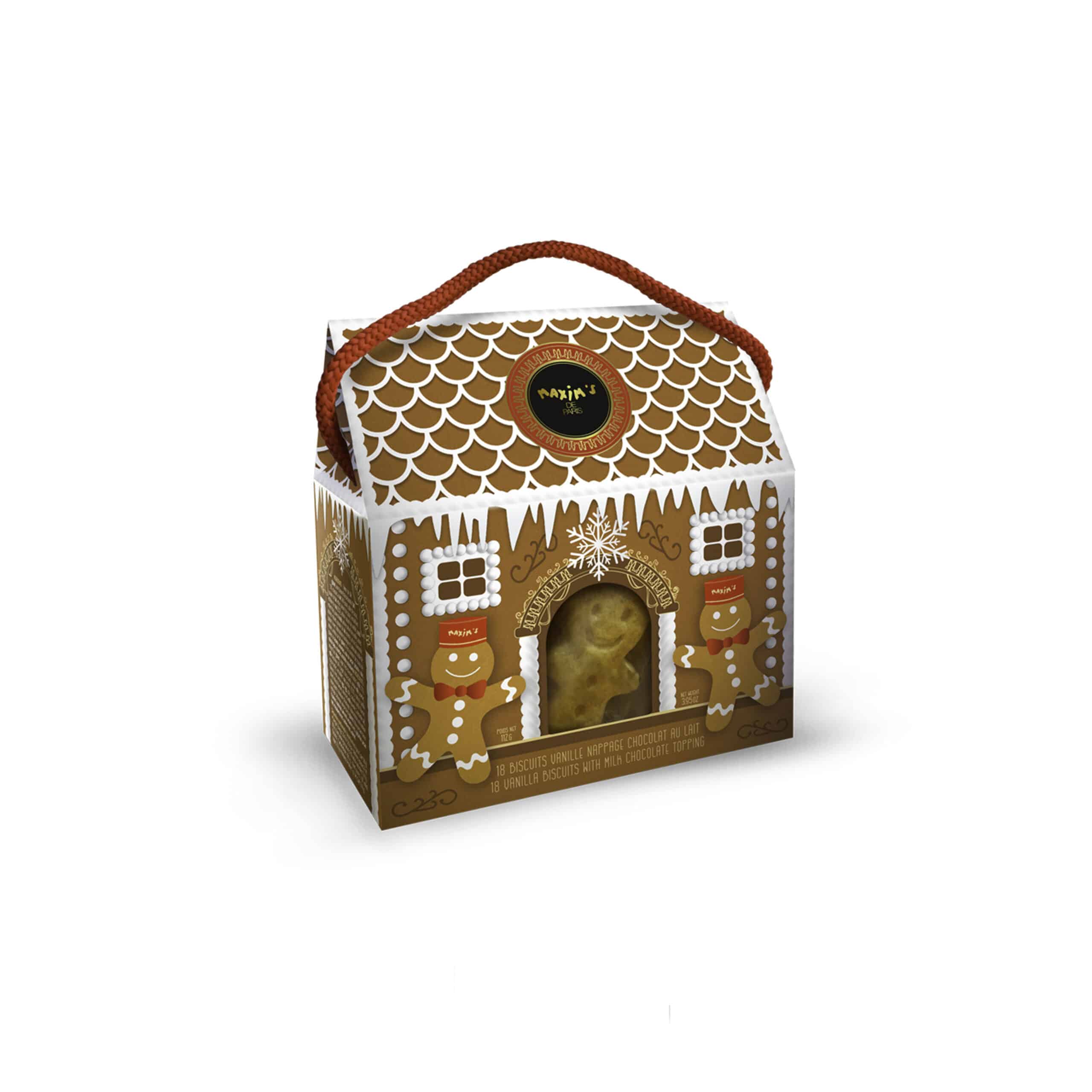 This adorable Christmas house features 16 delicious vanilla shortbread biscuits with a delicate layer of milk chocolate on the back. A novelty to slip under the tree or give as a gift, to delight young and old alike.